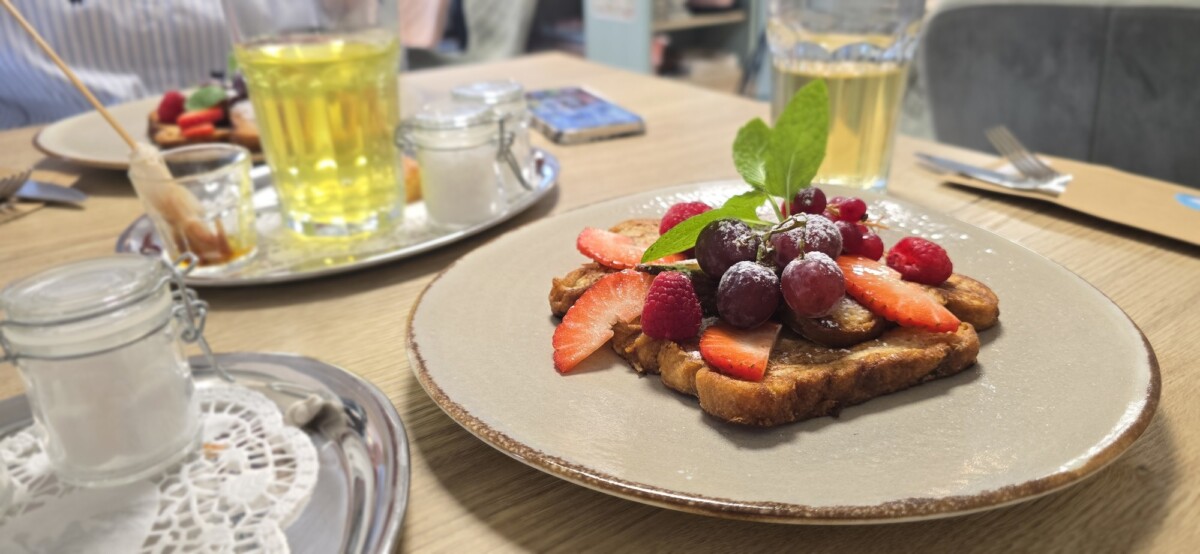 Ook de menukaart past bij de hele sfeer. Je kunt hier (op reservering) terecht voor een high tea, maar ook voor een gewone lunch. Wij kozen voor de wentelteefjes van suikerbrood met vers fruit . Een heerlijke combinatie met het zoete brood en frisse fruit. Liever iets hartigs? Dat kan. Er is een uitgebreide kaart met onder andere: